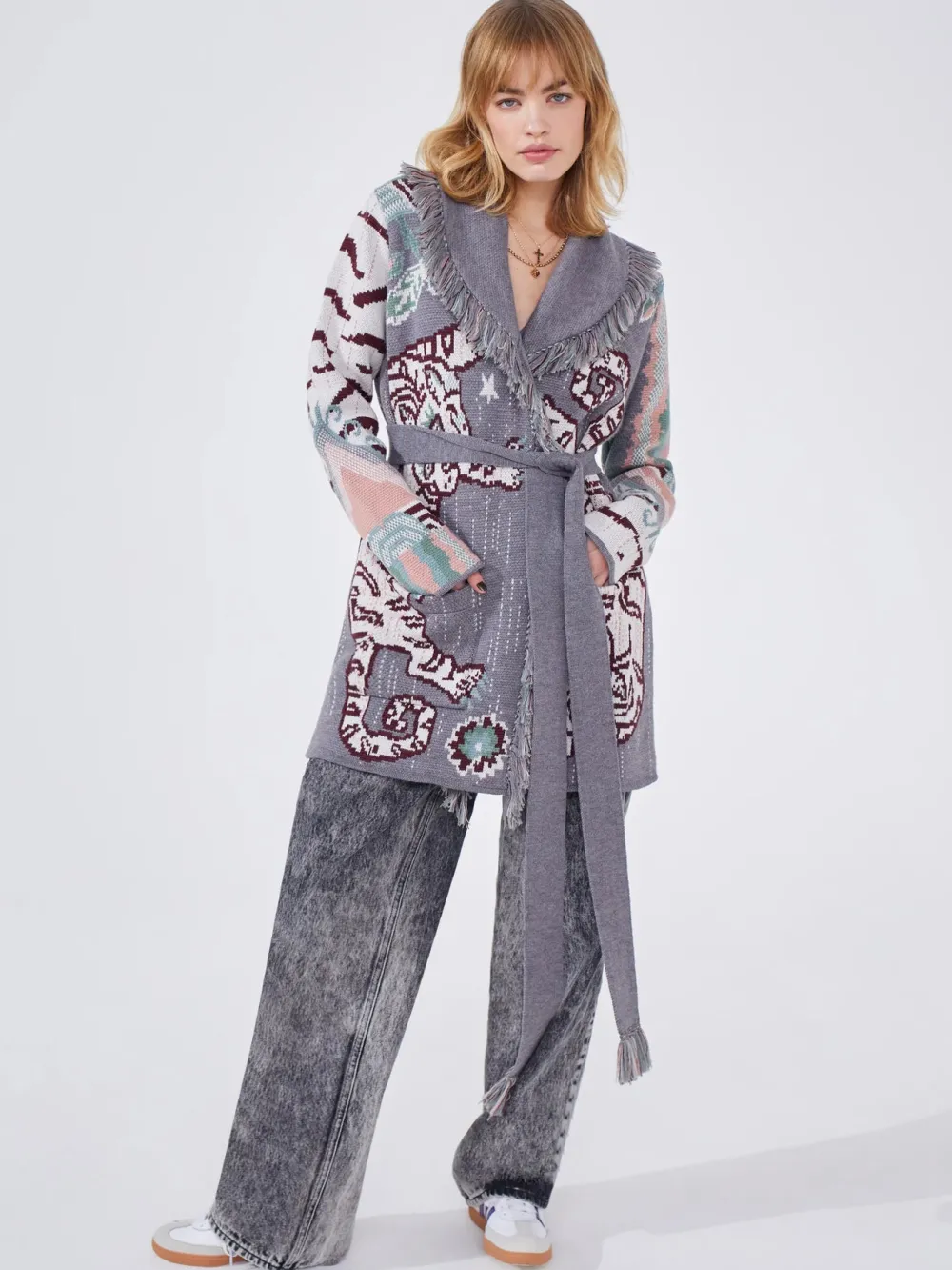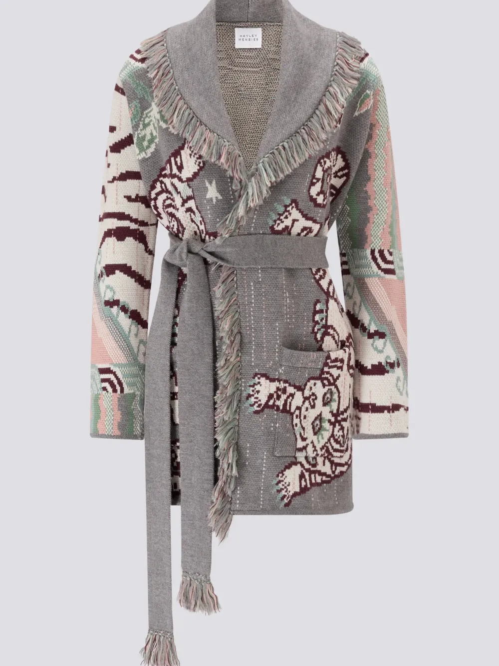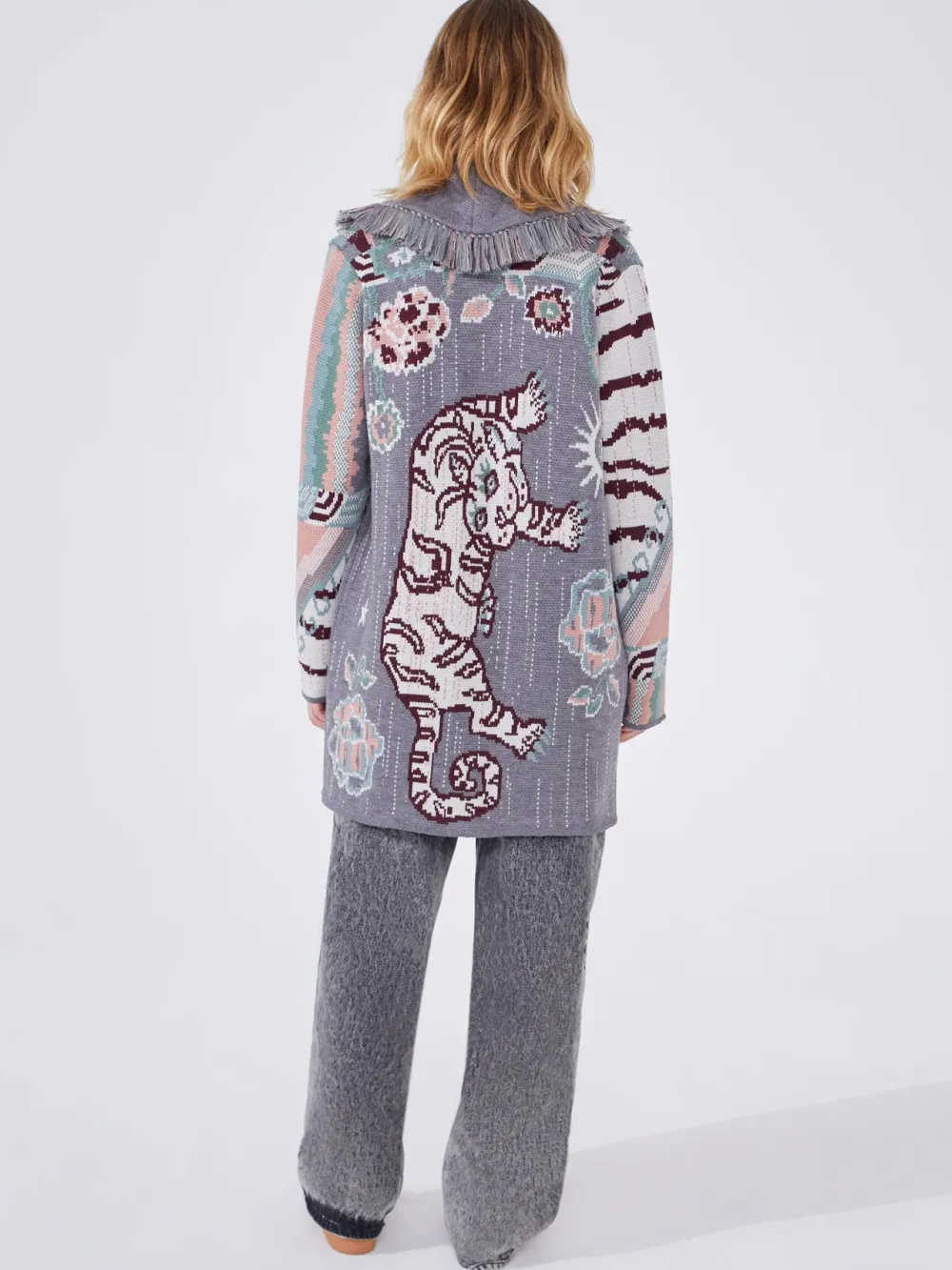 A symbol of strength, protection and authority, a majestic tiger motif inspired by ancient Tibetan Tiger rugs brings ferocity to this staple knitwear silhouette. Cross stitch design translated into merino wool, wear this jacquard cardigan open or closed over denim.