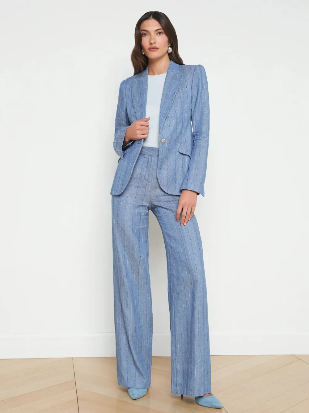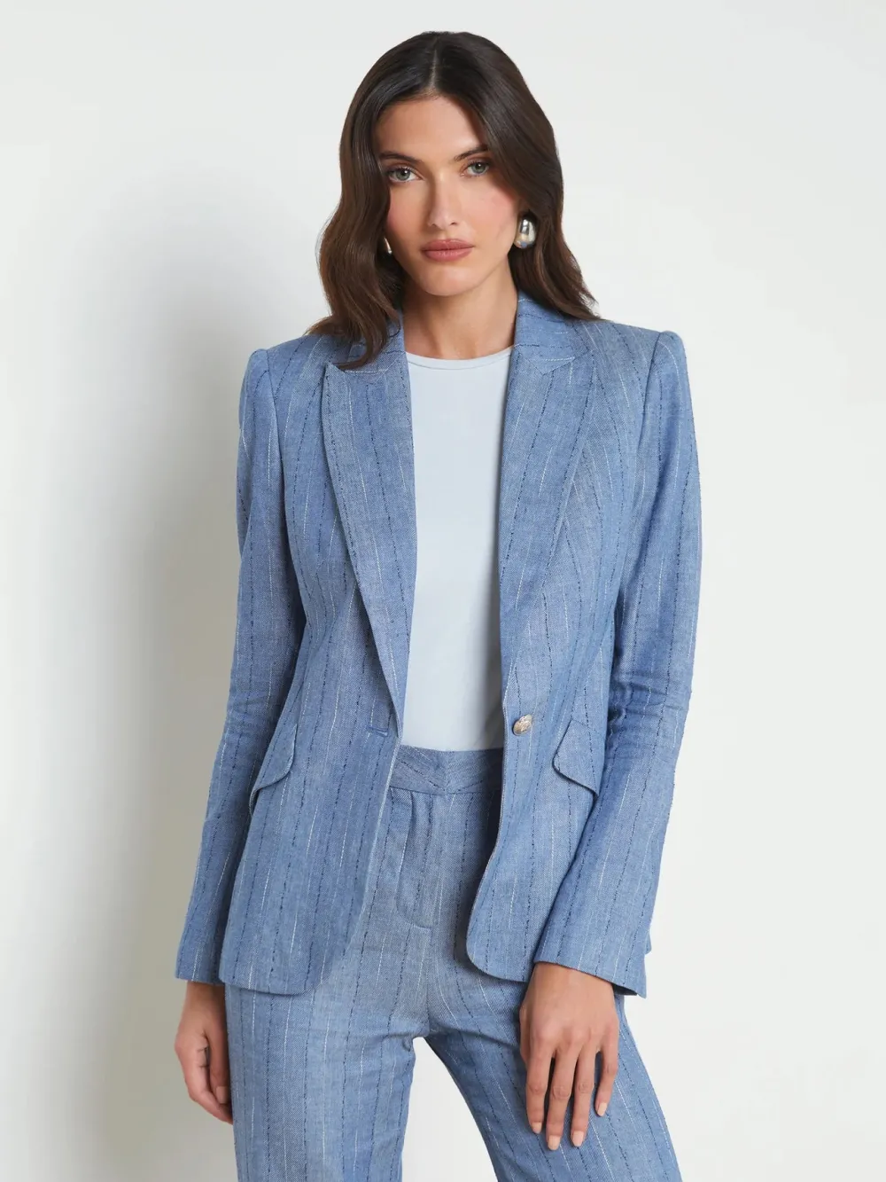 Our signature single-breasted blazer is back, now in a fresh linen blend. The Chamberlain blazer creates a beautifully proportioned silhouette with her strong shoulders and tapered seaming. Peaked lapels, flapped pockets, and back vents lend a tailored sharpness. Keep it daytime classic by pairing with our coordinating Livvy pant. Pair with denim for a smart weekend look.