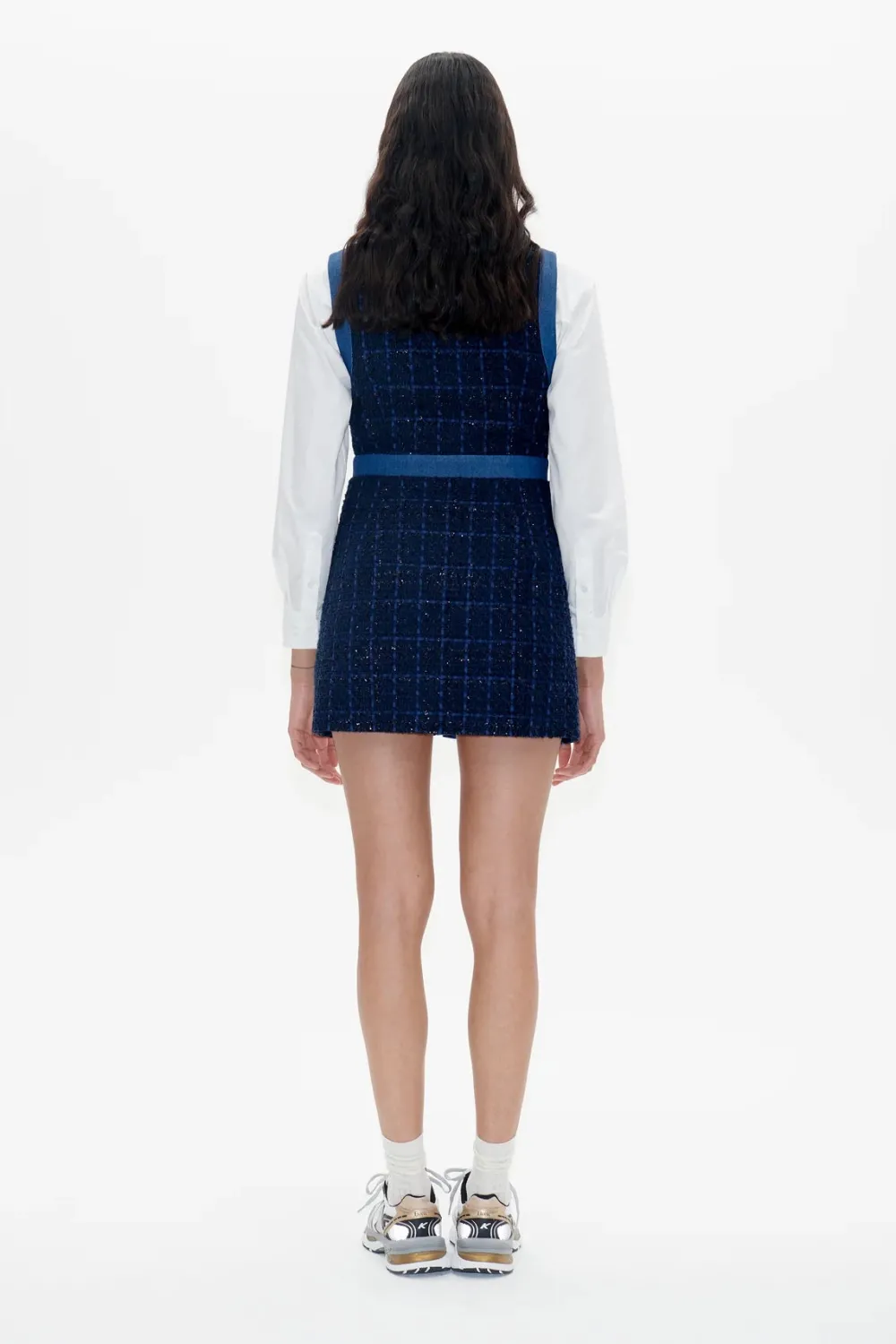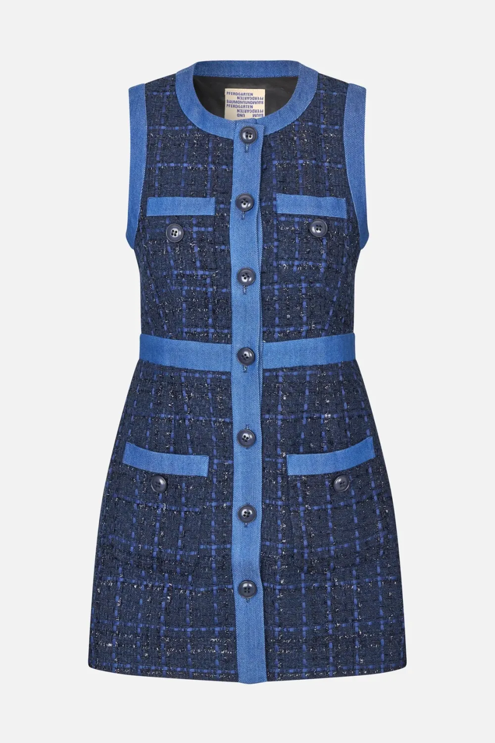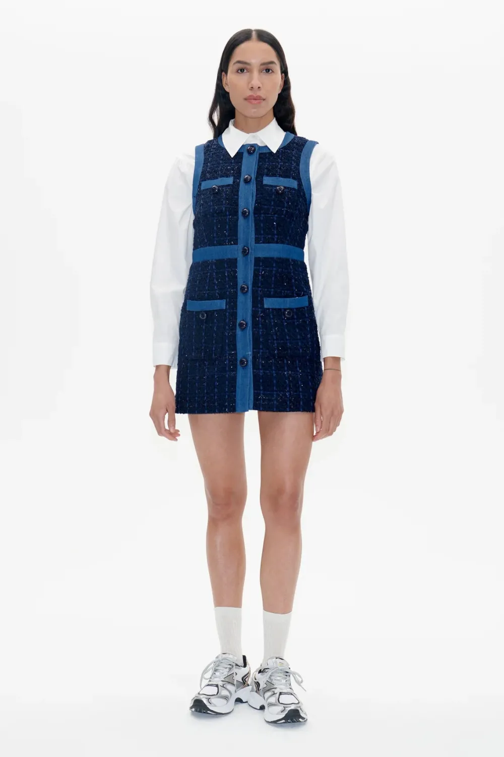 This sleeveless bouclé minidress features button closures in the front and four patch pockets. The dress is fully lined
