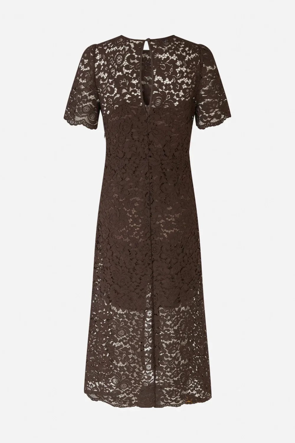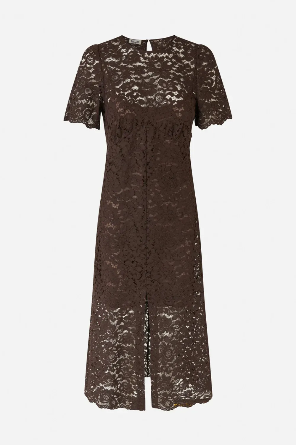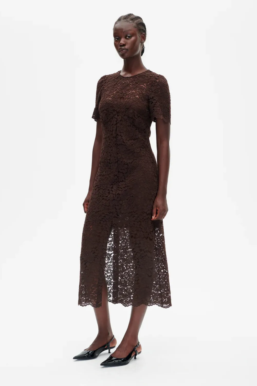 The Avigail Dress is a midi-length lace dress that embodies elegance with a modern twist. Its intricate lace design is complemented by a front slit for added sophistication and ease of movement. Featuring a scalloped hem and short sleeves, this dress offers a feminine and refined silhouette. The semi-sheer finish gives it a light, airy feel, making it perfect for special occasions or elevated daytime looks.
