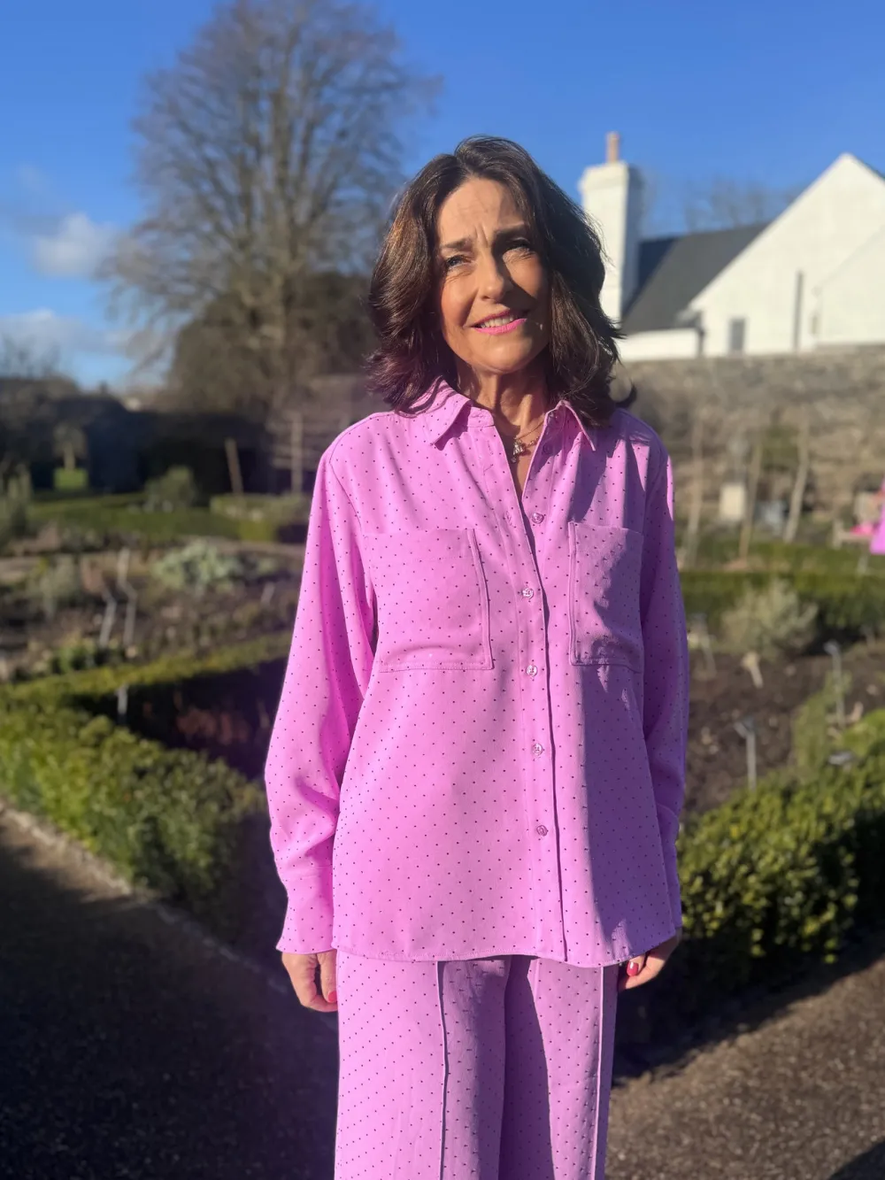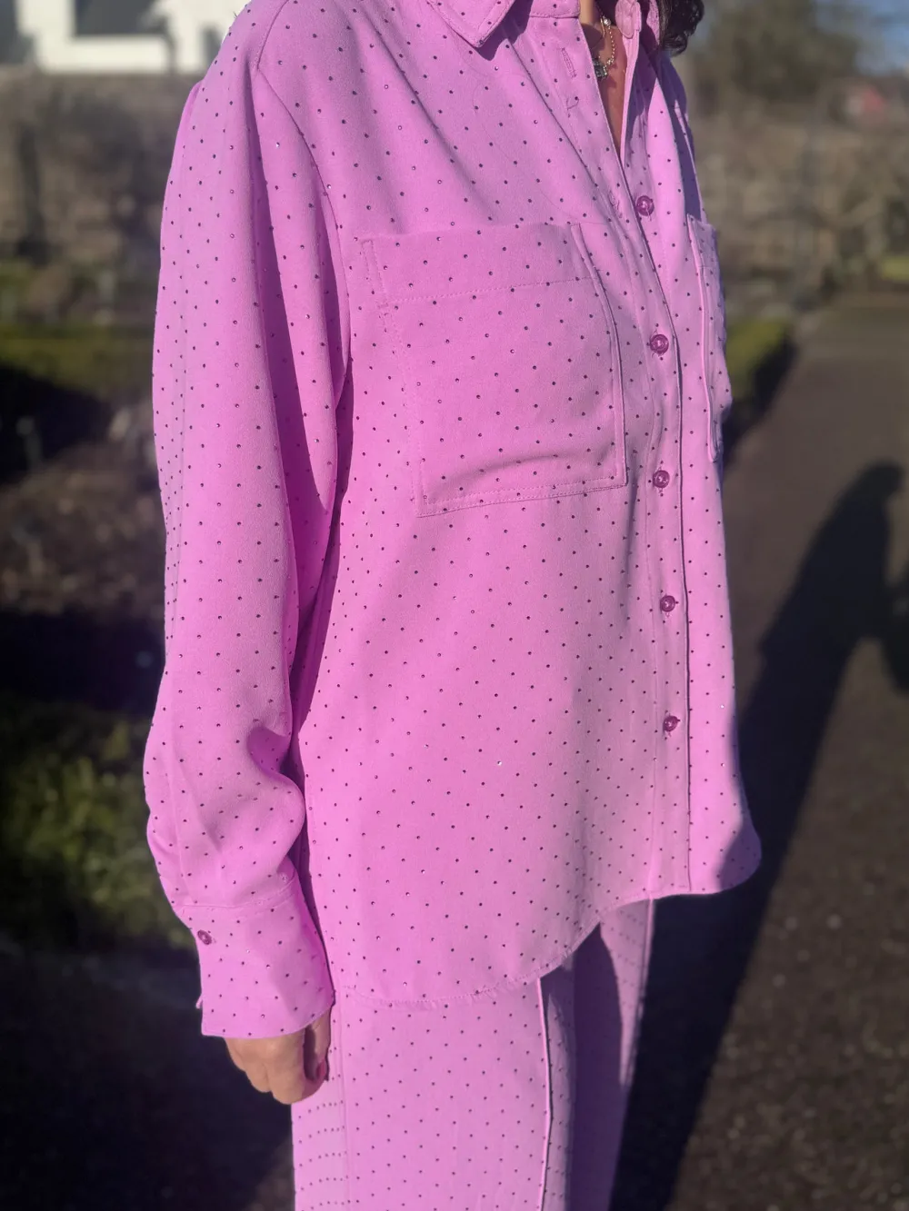 Button-down shirt is cut from a recycled polyester-blend fabric. The relaxed silhouette is adorned with rhinestones, giving it an extra touch of glamour.